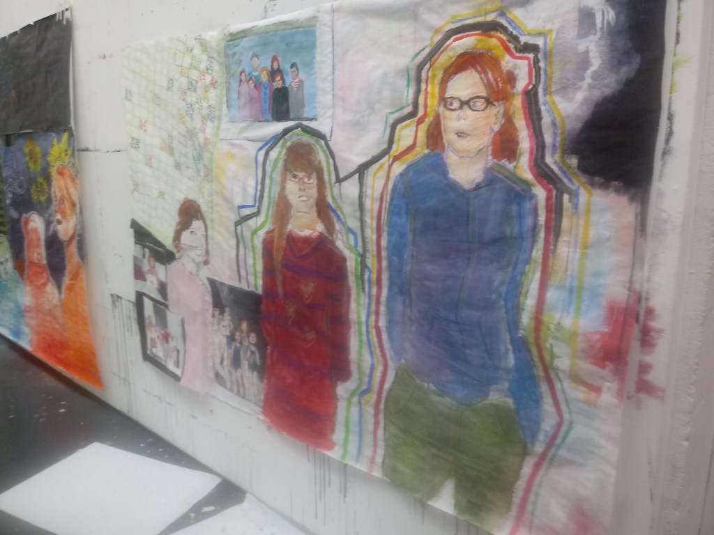 The task was to draw images of you between infancy, adolescent to young adult. I chose the age when I was 5 to 14 to 18.I chose those ages because they are the most memorable to what I used to look like. The materials I used to make it was acrylic paints and oil pastels. I used a massive piece of paper that I stapled on the wall. Everything on this paper was supposed to represent who I am and my history.
