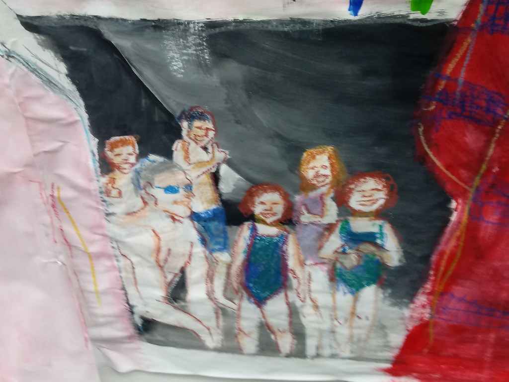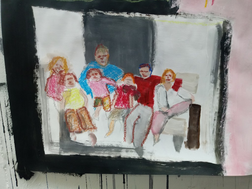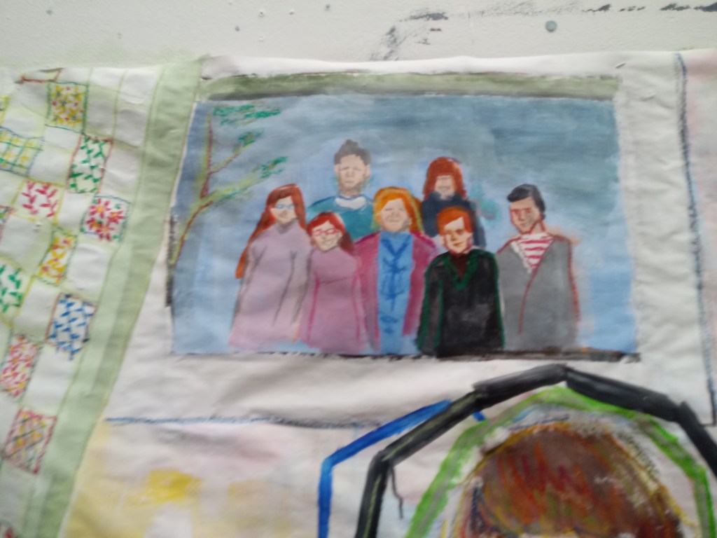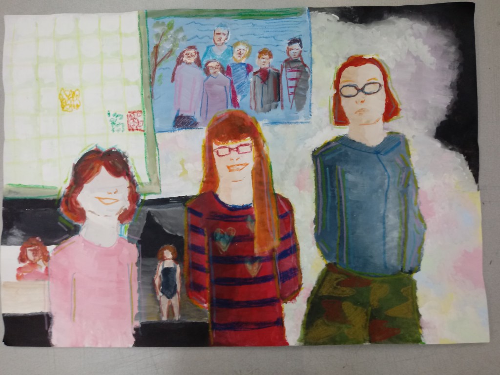 Family is a big part of my life so using oil pastels I drew my family that I copied from one of my family albums. I remember that image when me and my family went on a walk. I am one out of seven there’s my parents, the oldest brother john who is know 25, my older sister Juliette who is 22, my other brother Sam who is 20, my twin sister Bethany and then me I’m the youngest and we are both 18. My older sister wasn’t actually in this photo so I just added her in.