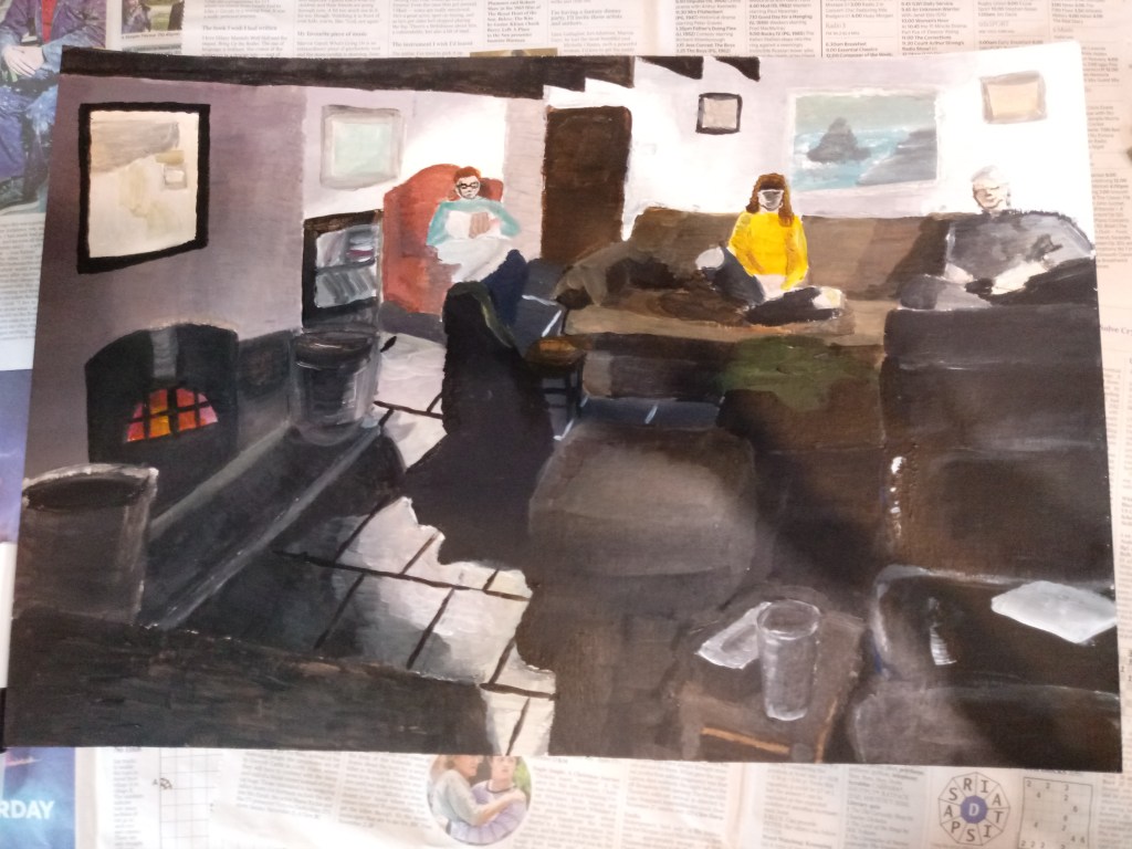 I took this photo of some of my family members trying to act natural in a dark lit area with a warm fire. I was pretty pleased with this photo because it really looked like an image you would see on a jigsaw puzzle, with the different characters and how random objects are scattered around the room and just the lighting is perfect for what I wanted to paint.