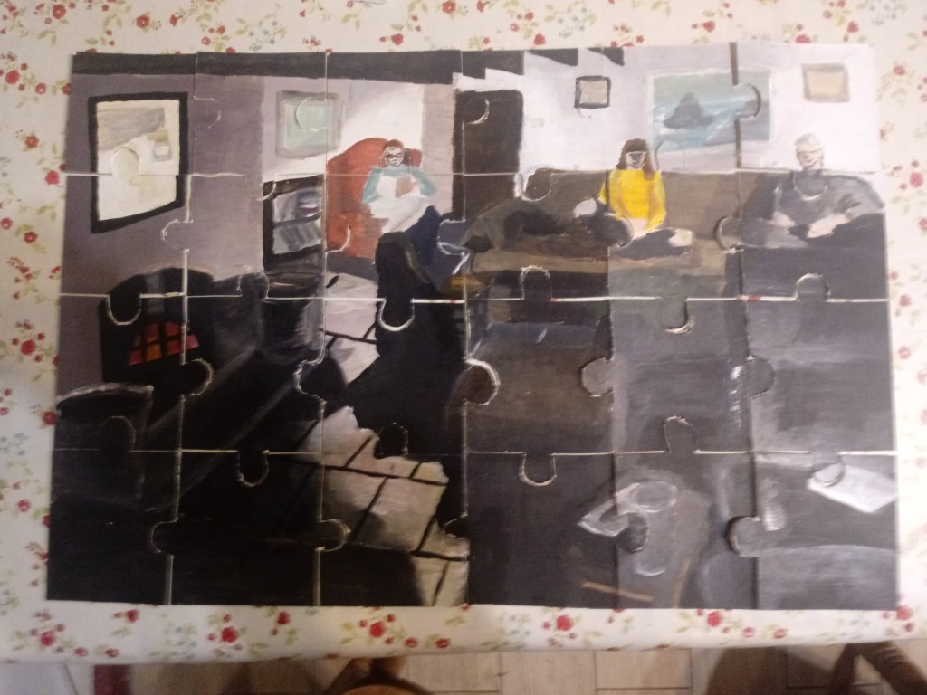This is the outcome of my project. I can say that I defiantly appreciate my painting a lot more when it’s cut out into jigsaw puzzles. I do believe it makes a convincing jigsaw puzzle.