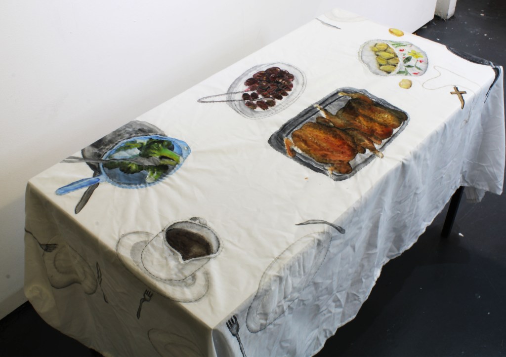 This is another Final Major project based on my Christmas dinner. It’s a table cloth with acrylic paintings of food and cutlery and I had sewn around each painting in different colored threads. 180 x 275cm