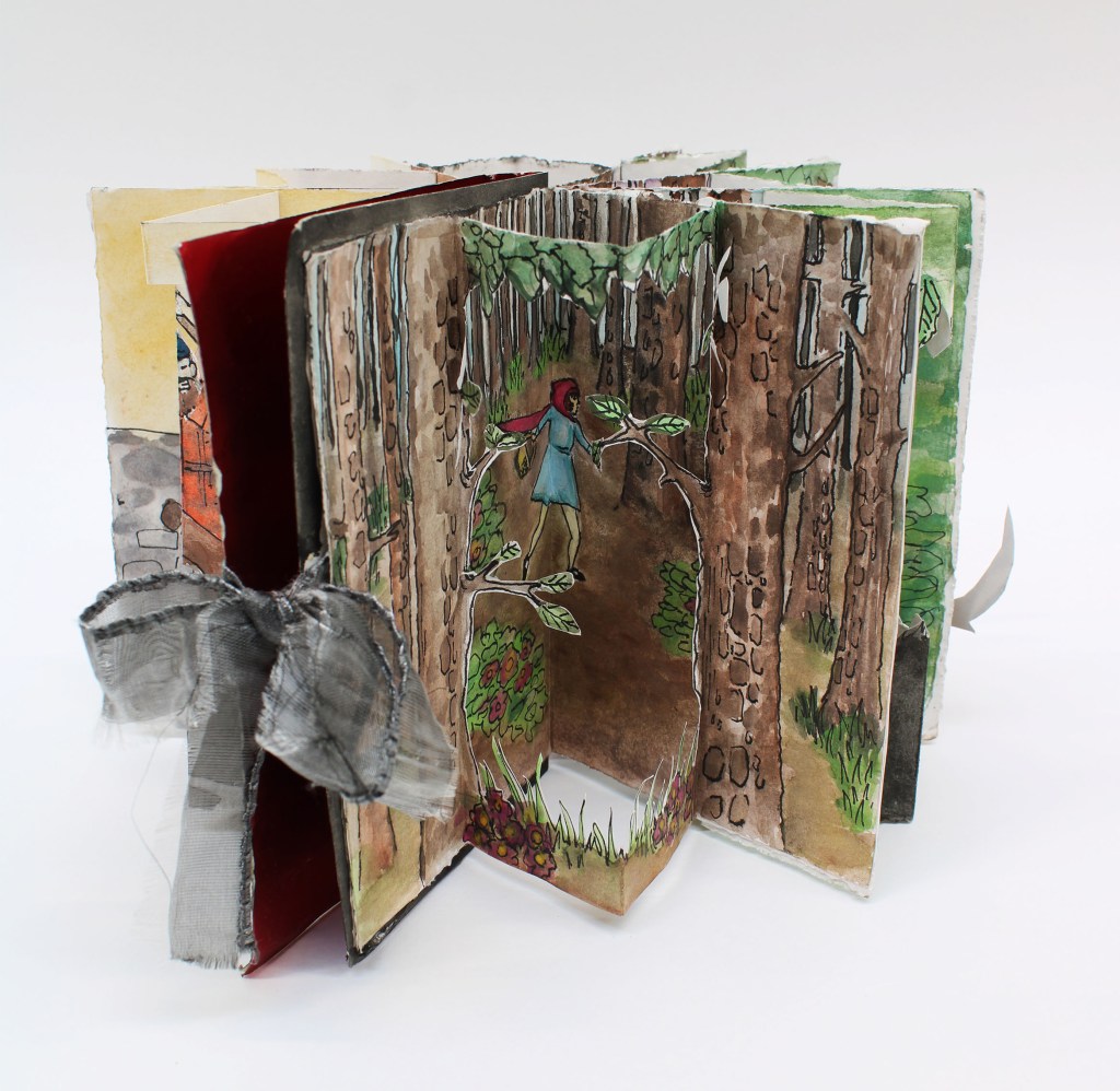 This is a pop out book based on the fairy tale Red Riding Hood. It has seven pages and 15.3cm in height and 11cm in width. Is is made of water colors and pen to out line the pictures.