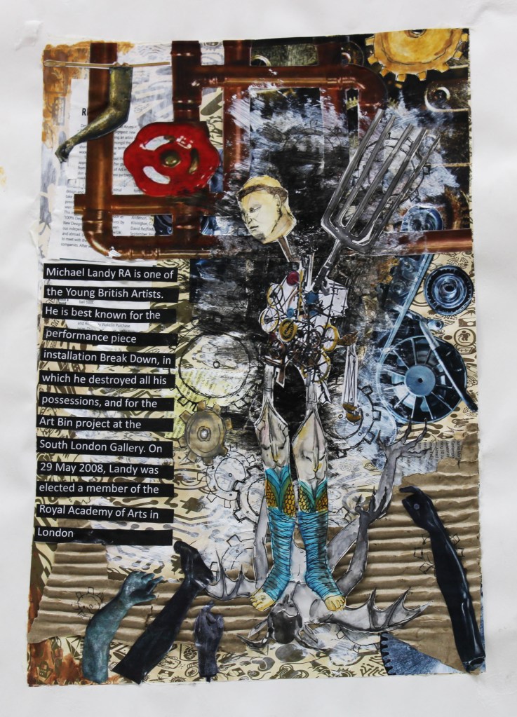 This is an art collage based on the artist Micheal Landy’s mechanical art pieces based on Saints. This is made of glued down images from the internet, pen, water colors, cardboard and acrylic paint. This is on an A1 sheet of paper.