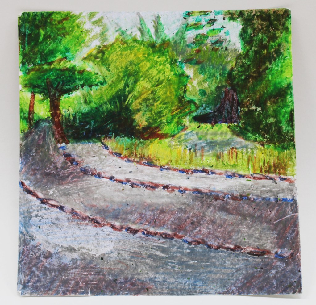 This is a landscape drawing made of oil pastels. This is based on a walk by a lake. It’s 20cm in height and width.