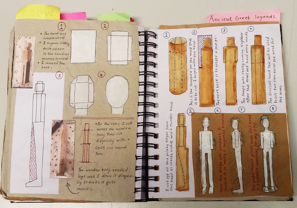 I thought of involving wood sculpturing because during quarantine I have based my two FMPs on wood sculpturing for my Folklore project. At the time wood was the only media I could use because I didn’t have any other materials but I became good at wood carving and created a string puppet dragon based on a viking dragon called ( Nidhogg ) dragon of death.