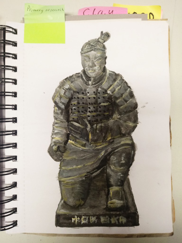 This is sketch that I copied from a small artifact that belongs to my mother. It’s a small replica based on a Chinese warrior in the Terracotta army made of stone. I colored it with water colors and drew over it with pen for detail.