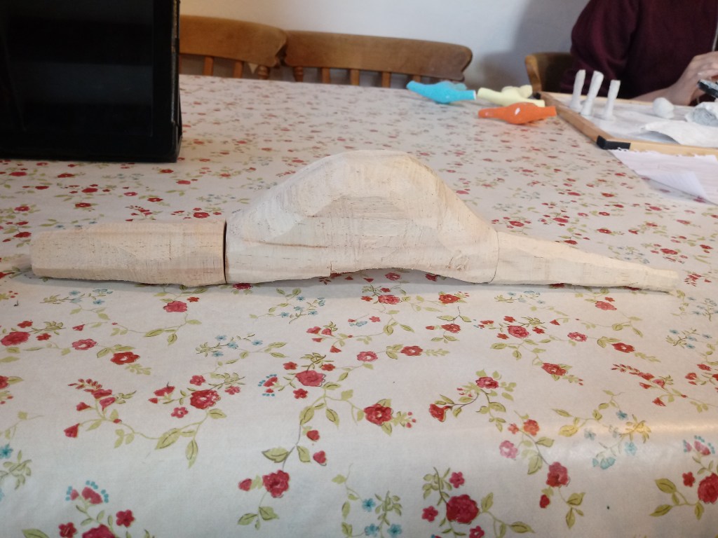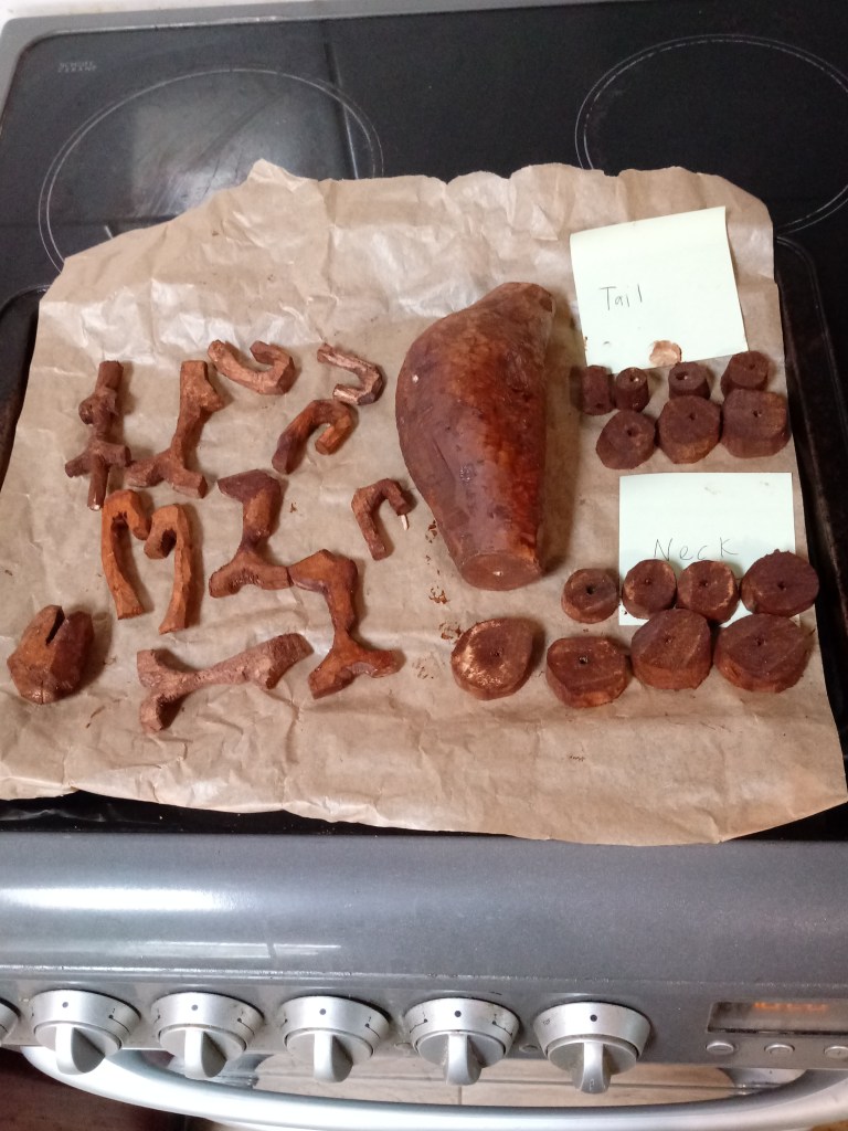 I eventually cut the tail and neck into pieces and drilled a hole through each of them. Drilling the holes was difficult because the draill refused to drill through the middle in some of them, so I was worried that the neck and head was going to look wonky.