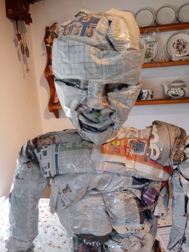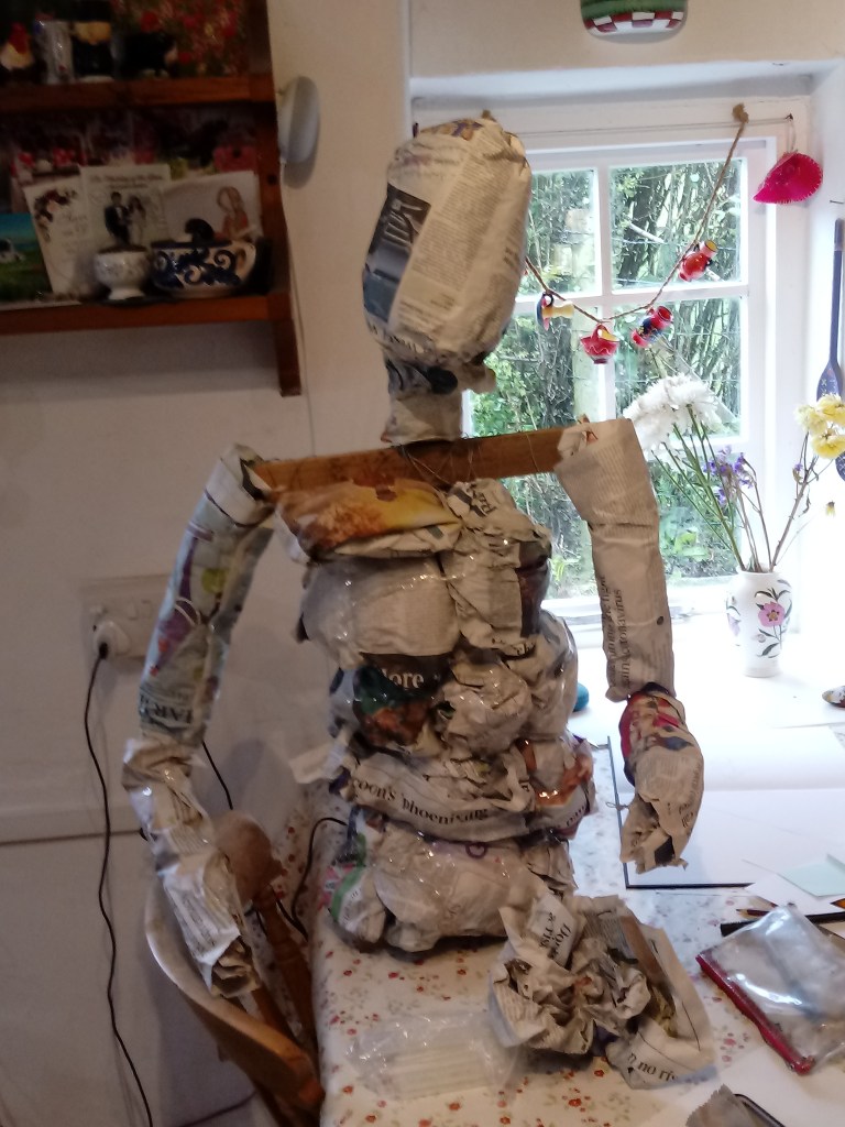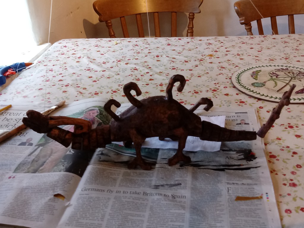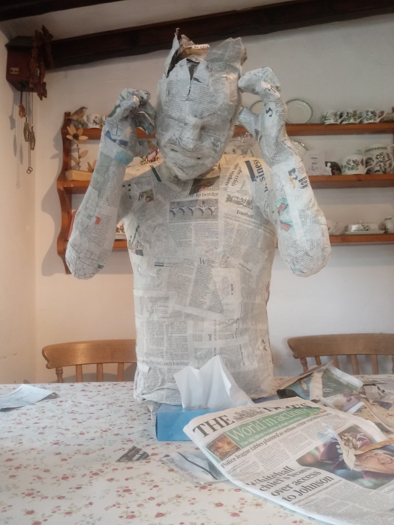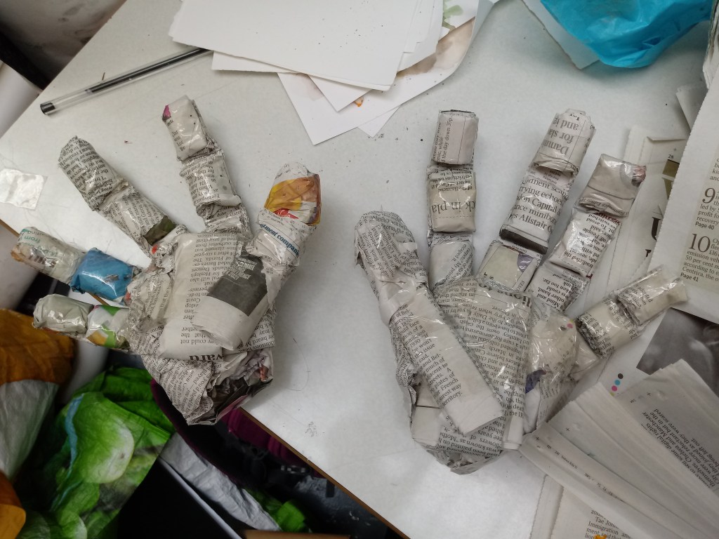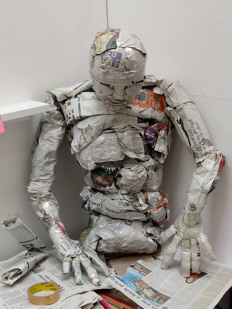 I put PVA glue on bits of paper and stuck it on to the sculpture and kept layering to make the body smoother and thicker. Compared to how it started out I never expected this outcome.