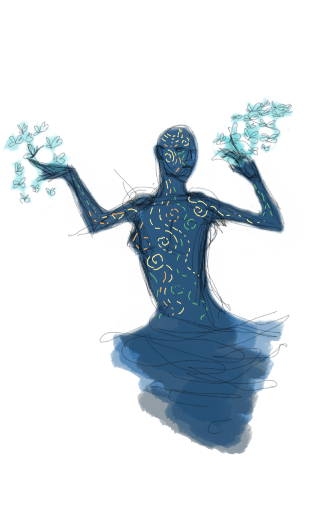 I began to explore different aspects of the idea and it became more emotional. This idea represents exploring your thought. The butterfly’s symbolize thoughts and the lady is gracefully exploring, observing and wondering over these butterfly’s. Exploring your thoughts is really trying to find some truth or closure to why we think certain things, to discover and understand yourself. I wanted to symbolize that process through a pose to try to humanize it.