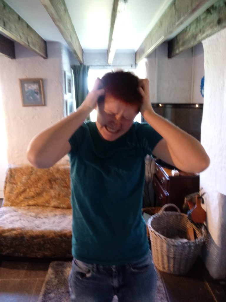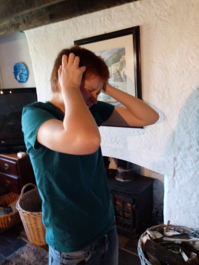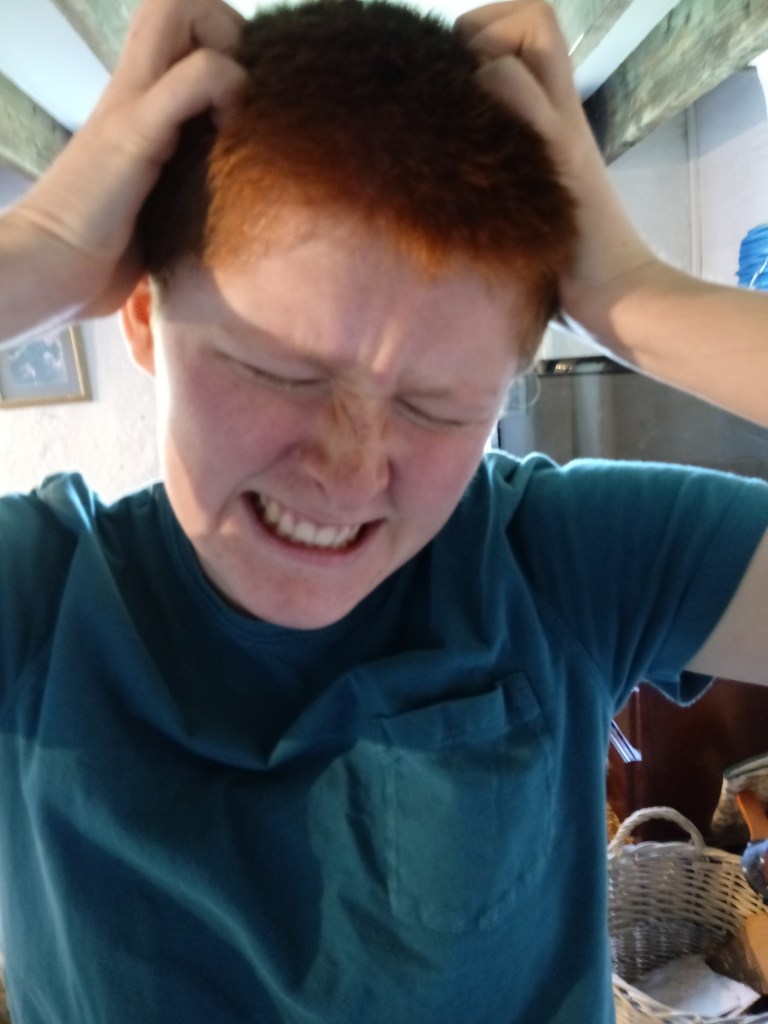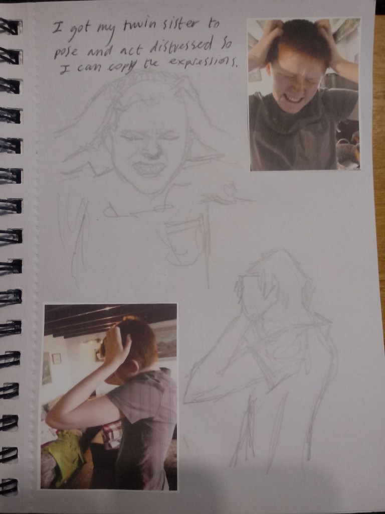 For my primary research I got my twin sister Bethany to pose in a distressed position so I can copy the images. I directed her put her hands on her head and act like her was trying to tear her head open out of frustration. This pose really expresses the emotion I was going for really well. I mostly admired the showing of the teeth and the eyebrows because it made the facial expression more complected to identify. The eyebrows show anger and rage but also they are slightly tilted up so the expression seems sadder like the person is falling apart, it’s a fearful expression.