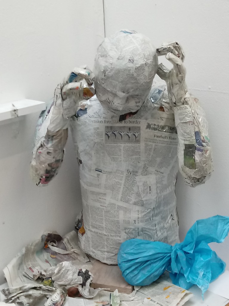 If I had more time I would have liked to make my FMP sculpture out of fabric and show my textile skills. I was in a debate in my head about deciding if I should color my paper sculpture in white paint to cover the prints on the news paper but Iam learning not to go all out with this project and to appreciate what I have created..